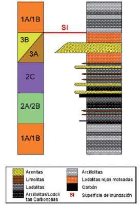 La identificación de las superficies de inundación (FIGURA 4) se soporta en la sobre imposición de acumulación en condiciones más profundas (fondo de lago) con respecto a la acumulación en condiciones marginales someras (borde de lago) y continentales (llanura aluvial). Estas interpretaciones están soportadas por: (1) las asociaciones litológicas de arcillolitas macizas y, arcillolitas y lodolitas laminadas corresponden a depósitos de fondos de lago; (2) mientras las asociaciones litológicas de lodolitas y arcillolitas con bioperturbación y carbonosas, limolitas laminadas y areniscas laminadas junto con la presencia de carbones corresponden a depósitos de bordes de lago (llanuras marginales, deltas) y; (3) el incremento en la asociación marino/manglar/lacustre sobre la asociación continental de las palinofacies y el incremento de pediastrum como indicadores de procesos de profundización de lagos o inundación de llanuras.