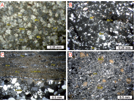 Fotomicrografías de secciones delgadas a 10X con nicoles cruzados. A. Sección PG7-72.4, (Formación Umir), mostrando los cristales de dolomita (Dol) embebidos en la matriz micrítica (Mic) y materia orgánica diseminada (MtOr). b. Sección PG10-174 (Formación Umir), litofacies AcL, ilustrando la angularidad de los granos, y granos flotantes de cuarzo tamaño arena fina (Qm) muy fracturados, y presencia de micas (Mi) y materia orgánica (mtOrg). c. Sección PG7-76.8 (Formación Umir), litofacies LoL, lodolitas probremente compactadas que generan abundante porosidad interlaminar (Por), en contacto con el lente de arenisca de grano medio. d. Foto tomada a 4X sección PG1-25.1 (Formación Lisama), litofacies LoB, granos de cuarzo tamaño limo con micas, y abundantes nódulos sideríticos de origen post-deposicional (Nod).