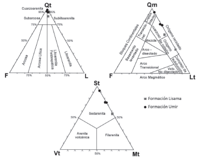 Diagramas de clasificación composicional QFL (Folk et al., 1970), de procedencia QmFLt (Dickinson, 1985), y contenido de líticos StVtMt (Folk, 1980) para las areniscas de la Formación Umir (círculos) y para las areniscas de la Formación Lisama (cuadrados).