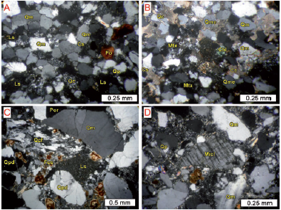 Fotomicrografías de sección delgada a 10X con nicoles cruzados. A. Sección PG7-60 (Formación Umir), con granos de cuarzo monocristalino (Qm), algunos con sobrecrecimiento de sílice (Cs), cuarzo policristalino (Qp), chert (Qc), líticos sedimentarios (Ls) y fragmentos de fósiles (Fo). b. Sección PG7-184.5 (Formación Umir) ilustrando el predominio de cuarzo monocristalino (Qm) con sobrecrecimiento de sílice, cuarzos euhedrales (Qme), cloritas (Chl), y formas de oolitos silíceos en la matriz (Mtx). c. Sección PG1-19.3 (Formación Lisama), fotos tomadas a 4X, con abundante contenido de cuarzo policristalino, difuso y foliado (Qpd, Qpf), y líticos sedimentarios (Ls). También se encuentran algunos fósiles (Fos, ostrácodos?) en la matriz. d. Sección PG1-12.0 (Formación Lisama), fragmento de microclina (Micl).