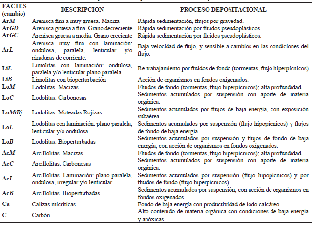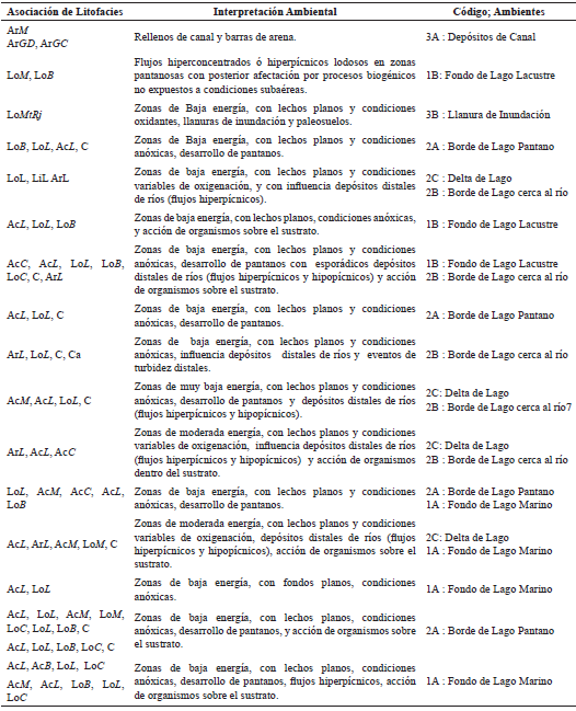 Se describieron un total 972,45 m de núcleos distribuidos en los cuatro pozos seleccionados, incluyendo la parte superior de la Formación Umir y la base de la Formación Lisama. En la TABLA 1 se indican las 17 litofacies identificadas, las cuales se ilustran en la FIGURA 3. Con estas litofacies se elaboraron 18 asociaciones que permitieron la identificación de los ambientes sedimentarios de fondo de lago, borde de lago y llanuras aluviales, descritas en la TABLA 2, que además se presenta de manera gráfica en la FIGURA 4.