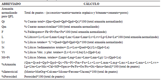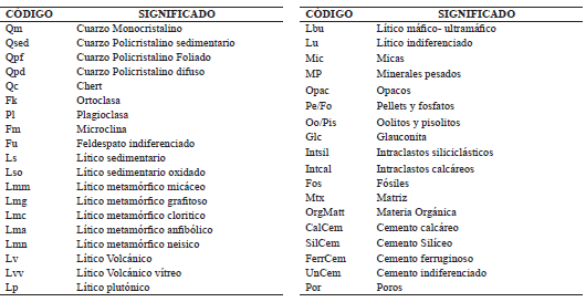 Areniscas: tres areniscas de la Formación Umir y dos de la Formación Lisama fueron analizadas. Los granos del armazón son dominantemente siliciclásticos. En menor proporción se encuentran algunos intraclastos de lodolita (TABLA 3). Para cada formación se discute a continuación la madurez textural (granulometría, redondez, calibrado, tipo de matriz), las asociaciones de grano y la porosidad medida tanto en muestra de mano como en la sección delgada. Las especificaciones del cálculo modal y el agrupamiento de armazón y material intersticial se presentan en la TABLA 4 y los resultados del conteo de 300 puntos en la TABLA 5.