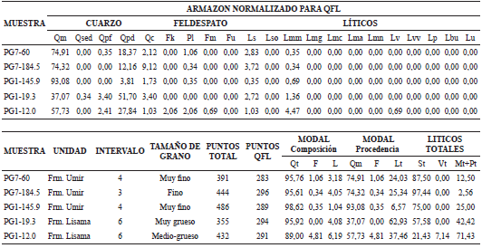 Las muestras PG7-60, PG7-184.5 y PG1-143.9 de la Formación Umir son cuarzoarenitas de grano muy fino a fino (FIGURA 7) y corresponden a las litofacies ArL. A pesar de la madurez composicional, los granos son en su mayoría angulares-subangulares, con contactos elongados y puntuales. La porosidad es escasa, de 0-2%, y se desarrolla principalmente por fracturas (porosidad secundaria). Los escasos líticos inestables (1-4%) son predominantemente sedimentarios (lodolitas, limolitas), y algunos trazas de metamórficos de bajo grado. En la fracción traza también se encuentran granos de plagioclasas macladas, moscovitas y cloritas, así como algunos minerales pesados como circón, epidota y esfena.