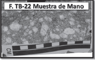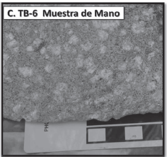 Muestra de mano de las rocas porfiríticas del domo de la Estación TB-6, escala en cm. D.