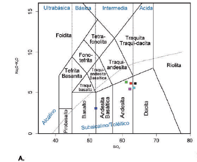 Diagrama TAS (LeBas et al., 1986) con la ubicación de las muestras, muchas de ellas coinciden en su posición.