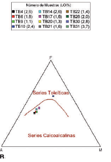 Diagrama AFM (Irvine and Baragar, 1971) para diferenciar series toleíticas de las alcalinas. En las series calco-alcalinas también hay coincidencia de ubicación de las muestras. En la leyenda, con el número de la muestra entre paréntesis se muestra el valor del % de LOI. Localización de las muestras en la FIGURA 1.
