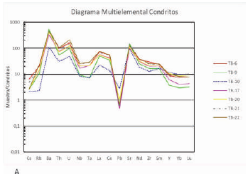 Los elementos traza muestran en un diagrama multielemental normalizado con respecto a condritos (FIGURA 5A), elementos litófilos de radio iónico grande LILE (Rb, Sr, Ba, U, Pb, Cs, Th) tienen un comportamiento similar con excepción de la muestra de lava con composición basáltica, la cual presenta un enriquecimiento menor con respecto a las otras muestras, no obstante los elementos como Sr, U y Pb tienen un patrón similar. En los elementos de alto potencial iónico, HFSE (Zr, Nb, Ta), la tendencia del empobrecimiento es muy mezclado y no hay un patrón definido en todas las muestras. En un diagrama de Sr/Y vs Y (FIGURA 5B) la mayoría de las muestras se localizan en el campo de rocas con afinidad adaquítica (Castillo, 2006), con excepción de la muestra de lava de composición basáltica (TB-10) y la muestra del cuerpo sub-volcánico más sur del área estudiada (TB- 26, FIGURA 1).