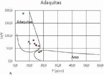 El mayor contraste con las áreas estudiadas en el departamento de Antioquia es que la mayoría de las muestras de andesitas y dacitas de los cuerpos sub- volcánicos de nuestra área de trabajo son ricas en plagioclasa y anfíbol, y muestran una afinidad adaquítica (FIGURA 5B). Las características geoquímicas que sugieren esta afinidad y concuerdan en su mayoría con las propuestas por Castillo (2006) son: SiO2>56%, Al2O3 >15 %, MgO < 3%, Na2O entre 3,5 y 7,5%, K2O/Na2O~ 0.42, alto fraccionamiento de HREE, ausenciade anomalías de Eu, Yb ≤1,8 ppm, Y <18 ppm, altoscontenidos de Sr (>400 ppm), Sr/Y > 20 y La/Yb > 20,y bajas relaciones de 87Sr/86Sr ≤ 0,0704 (FIGURAS 5A,6 y 8).