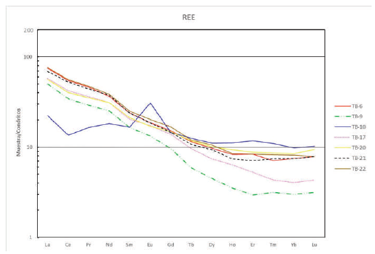 El diagrama multi-elemental de elementos de tierras raras, REE, normalizado a condritos (Sun and McDonough, 1989) muestra un grupo dominante de muestras con enriquecimiento en las tierras raras livianas, LREE (La, Ce, Pr, Nd Pm), con excepción de la muestra de lava de composición basáltica (FIGURA 6). En las tierras raras medianas, MREE (Sm, Eu, Gd, Tb, Dy) la mayoría de las muestras presentan igual tendencia de empobrecimiento y ausencia de una anomalía de Eu, con excepción de la muestras TB-10 que tienen un patrón contrario de enriquecimiento muy distinto al resto de las muestras, con una anomalía positiva de Eu muy marcada. El patrón de las tierras raras pesadas, HREE (Ho, Er, Tm, Yb, Lu) en las muestras tiene una tendencia plana regular constante, donde solo dos de las muestras de los cuerpos sub- volcánicos (TB-9 y TB-17) tienen una relaciones diferentes de MREE/HREE (Gd/Yb) >3,9 y de LREE/ HREE (La/Yb) >19,7 con respecto a las otras muestras (FIGURA 7).