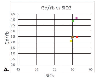 Proporciones de MREE/HREE (Gd/Yb) vs SiO2