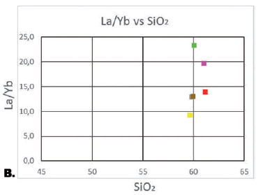 Proporciones de LREE/HREE (La/Yb) vs SiO2. Las proporciones en las muestras TB-9 y TB-17 (localizadas en la parte superior) se podrían tomar como indicios de una proveniencia magmática asociado a la placa subducente. Colores de las muestras igual que en la leyenda de la FIGURA 4.