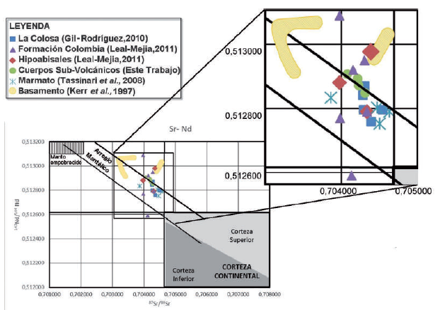 En este trabajo se propone que las firmas adaquíticas encontradas en el sur de la subcuenca de Amagá podrían estar relacionadas con fundidos derivados del manto como lo sugieren la homogeneidad isotópica de Sr-Nd y las muy bajas composiciones isotópicas radiogénicas de Sr, tanto para las muestras de este trabajo como para las del Stock de Marmato (Tassinari et al., 2008) y de los cuerpos hipoabisales de la Formación Combia (Leal- Mejía, 2011; ver FIGURA 8). Para Tassinari et al. (2008) estas relaciones isotópicas sugieren un magma derivado del manto como principal fuente tanto para el magmatismo toleítico y calcoalcalino de la Formación Combia, y discuten que no puede ser descartada una contribución magmática menor resultante de la fusión de la corteza continental inferior.