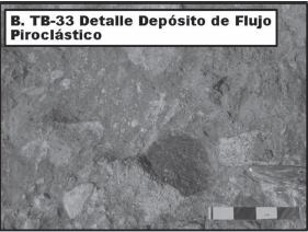 Detalle de los depósitos de flujos piroclásticos de bloques y cenizas de la estación TB-33; escala, barra en cm
