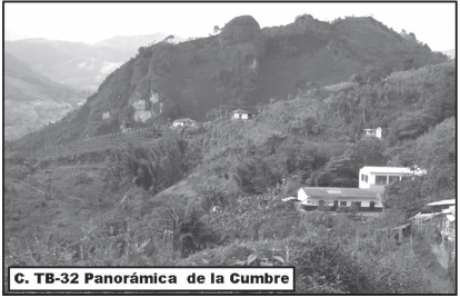 Estación TB-32, panorámica del sector de La Cumbre en el municipio de Quinchía (departamento de Risaralda) mostrando el espesor de los depósitos de flujos piroclásticos del Miembro Inferior de la Formación Combia.