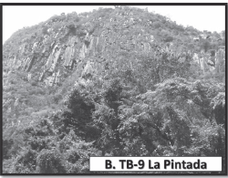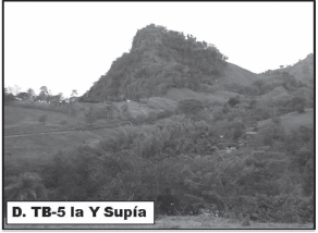 Estación TB-5, sector de la Y, municipio de Supía (departamento de Caldas): depósitos del Miembro Superior de la Formación Combia intruidos por un domo volcánico. Localización de las estaciones en la FIGURA 1.