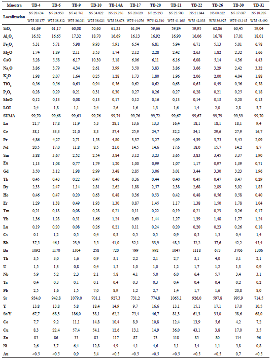 Las determinaciones de elementos mayores y trazas en roca total fueron realizadas en Acme Analytical Laboratories Colombia (TABLA 1). Fueron tomados 0,2 g de cada muestra triturada y mezclada con un fundente LiBO2/Li2B4O7 para fundirla en una mufla. La perla enfriada es disuelta en HNO3 al 5%, y son analizadas por ICP y/o ICP-MS. La pérdida por ignición (LOI) se halló por la diferencia de peso después de la ignición a 1.000° C. Los límites de detección para elementos mayores incluido LOI fueron de 0,01% con excepción de Fe2O3 y K2O: 0,04%. Para elementos traza y tierras raras los límites de detección fueron 5 ppb (Au); 0,05 ppm (Sm, Gd, Dy, Yb); 0,01 ppm (Tb, Tm, Lu, Ni); 0,1 ppm (La, Ce, Cs, Rb, U, Nb, Ta, Pb, Y, Cu); 0,2 ppm (Pr, Eu, Ho, Th, Co); 0,3 ppm (Nd, Er, Sr); 1 ppm (Zn); y 5 ppm (Ba).