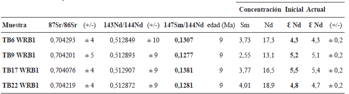 Para estudiar la composición isotópica de Sr-Nd se llevaron a cabo cuatro análisis en roca total de las muestras TB-6, TB-9, TB-17 y TB-22 de los cuerpos sub-volcánicos (TABLA 2) y fueron llevados a cabo en un (MC)-ICP-MS multi-colector Thermo-Finnigan Neptune en Washington State University (Pullman, WA). Para los análisis isotópicos de roca total de Sr y Nd, se tomaron alícuotas de polvos de roca total de aproximadamente 0,25 gramos, que fueron disueltas a alta presión en bombas de teflón encamisadas en acero con una mezcla 10:1 de HF y HNO3 a 150°C entre 5 y 7 días. Los análisis de Sr fueron corregidos por fraccionamiento de masas usando 86Sr/87Sr = 0,1194 y normalizados usando NBS-987 como estándar. Análisis de Nd fueron corregidos por fraccionamiento de masas usando 146Nd/144Nd=0,7219 y normalizados usando el estándar Ames Nd. Las incertidumbres de las composiciones isotópicas reflejan errores 2σ que ocurren durante la corrida de las muestras en el laboratorio.