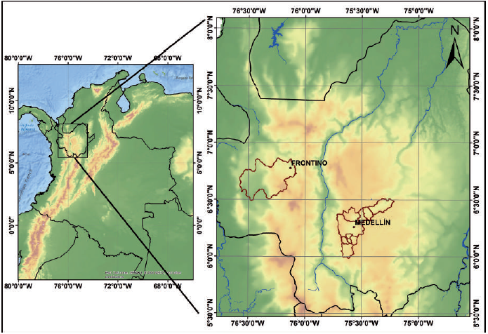 Localización geográfica de la zona de estudio, en el municipio de Frontino, departamento de Antioquia, Colombia.Se incluye como referencia la ubicación de la ciudad de Medellín y su área metropolitana