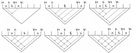 Representación de la elaboración de la pseudosección en el ensayo dipolo-dipolo. Los símbolos I+ e I- denotan la ubicación de los electrodos de corriente, y los símbolos V+ y V- hacen referencia a la ubicación de los electrodos de potencial. Esta representación corresponde al esquema de conmutación de electrodos implementado en este estudio, donde mediante arreglos de siete electrodos con diferentes separaciones se construyeron las pseudosecciones