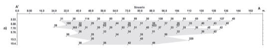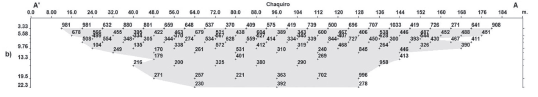 Pseudosecciones de resistividad aparente que muestran las coordenadas de los datos tomados bajo superficie con el ensayo dipolo-dipolo. a) Sincerín.