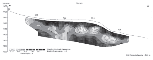 Perfil de resistividad eléctrica para el sector de Sincerín. La localización de la línea eléctrica se encuentra en la FIGURA