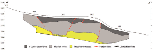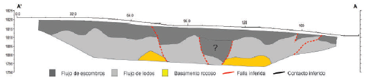 La identificación de las estructuras en las imágenes tomográficas se basó en dos criterios principales: el primero basado en altos contrastes laterales de resistividad eléctrica, que pueden representar transiciones abruptas entre el basamento rocoso, los flujos de escombros y/o los flujos de lodo (Noriega y Caballero, 2015); y en segundo lugar, cuando se registran zonas de baja resistividad se relacionan con sectores de alto fracturamiento, cuya alta permeabilidad favorece la infiltración y posterior saturación de agua. Estos parámetros permitieron delinear, al menos parcialmente, la geometría subsuperficial de las fallas.