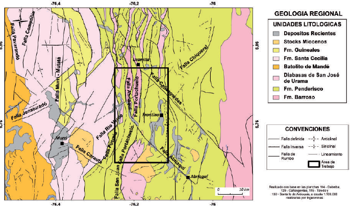 En la parte occidental se encuentra el Batolito de Mandé, un cuerpo plutónico elongado que hace parte de un magmatismo Paleoceno – Eoceno (Montes et al., 2012), y que puede constituir parte del bloque oriental del Bloque Panamá-Chocó (Duque-Caro, 1990) junto con rocas vulcanosedimentarias de la Formación Santa Cecilia y los sedimentos de la Formación Guineales de edades Cretácico-Paleoceno y Oligoceno, respectivamente (González y Londoño, 2003). Espesos depósitos recientes se concentran en los fondos de los valles, formando complejos sistemas de terrazas que cubren parcialmente el basamento y estructuras geológicas en la zona de estudio (González y Londoño, 2003).