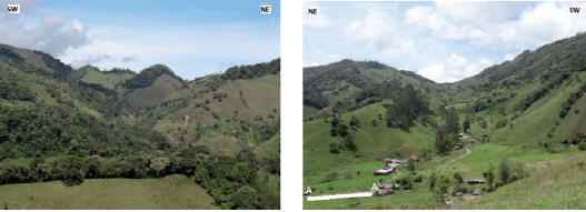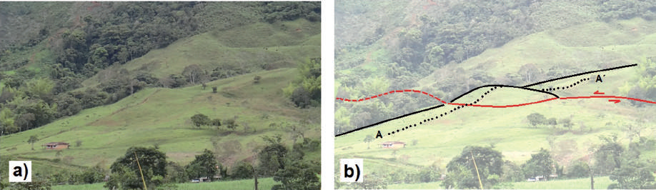 Silletas de falla que demarcan el paso de la Falla Abriaquí sobre la cuenca del río El Cerro. La ubicación del perfil A-A’ se especifica en la FIGURA 6.