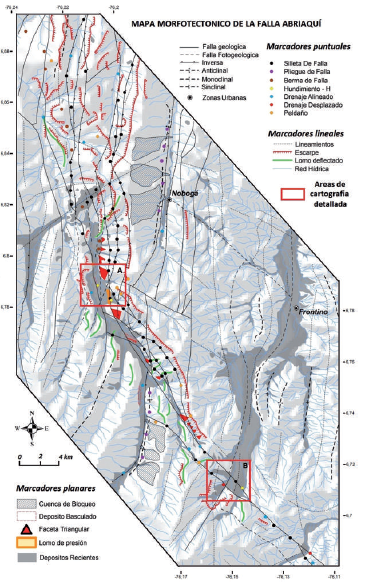La estructura de interés en el presente estudio corresponde a la Falla Abriaquí, que atraviesa la cuenca del río El Cerro con orientación NW, desde el sector de El Chaquiro hasta el sur del alto de Musinga. A medida que se prolonga al NW, la falla tiende a curvarse en sentido N-S, cambiando su comportamiento lateral izquierdo a una dinámica predominantemente inversa con componente sinestral (González y Londoño, 2003; Noriega y Caballero, 2015) (FIGURA 3). La estructura presenta una expresión morfológica bien definida por silletas alineadas, facetas triangulares, control de drenajes y deformación de depósitos recientes en el sector (Page, 1986; Noriega y Caballero, 2015).