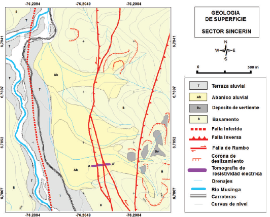 Para el sitio Sincerín se aprecia deformación de los depósitos de vertiente recientes y una expresión en superficie que corresponde a un lomo de presión formado a partir de dos estructuras locales de la Falla Abriaquí, que deforma y moldea la morfología de la zona.