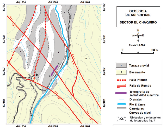 En el sector de El Chaquiro no es posible determinar afectaciones superficiales mayores ya que su expresión es apenas perceptible, por lo cual la evaluación geoeléctrica sirve como criterio en la determinación de fragmentos de basamento levantados según los contrastes y cambios de resistividad aparente medidos y estimados en la tomografía, como lo sustentan los perfiles de resistividad presentados en este estudio.