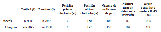 Existe una alta correlación entre los resultados obtenidos en las tomografías de resistividad eléctrica y los modelos geológicos propuestos para los sitios Sincerín y El Chaquiro. Por otro lado, la raíz media cuadrática del desajuste entre la resistividad medida y la estimada por los modelos es aceptable, con valores inferiores a 15 %, siendo de 14,6 % para Sincerín y de 9,8 % para El Chaquiro.