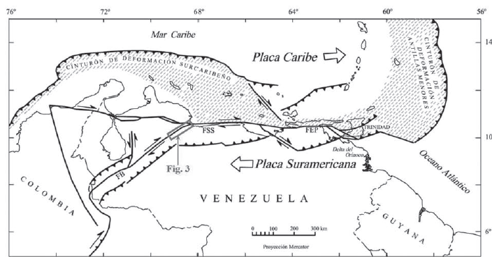 Marco geodinámico simplificado del límite sur de la Placa Caribe (modificado de Audemard et al., 2000). Se señalala ubicación relativa de las FIGURAS 2 y 3. Leyenda: FB Falla de Boconó; FSS, Falla de San Sebastián; FEP, Falla El Pilar