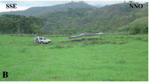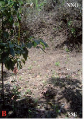 Sitio de excavación de la trinchera paleosísmica de Yaritagua. A) Vista hacia el oeste de la trinchera de falla, donde se observa el pie del escarpe de falla de exposición sur