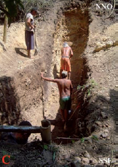 Proceso de excavación manual, donde ya se puede apreciar los canales aluviales ricos en materia orgánica en primer plano dentro de la excavación, mientras en segundo plano se aprecian los conglomerados fuertemente cementados de color crema del abanico de Yaritagua.