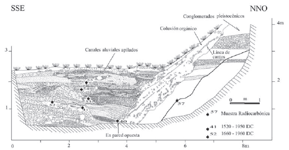 Las paredes de la excavación revelan el desarrollo del canal de un río de granulometría francamente granodecreciente, el cual a su vez es cortado por un canal más joven hacia el extremo NNO de la excavación, construido a expensas de canales aluviales más pequeños apilados verticalmente e interdigitados con coluviones fuertemente orgánicos del talud norte del mismo canal (entre 2,5 y 5 m del levantamiento mostrado en la FIGURA 9). Estos canales más pequeños presentan buena estratificación interna, con variaciones verticales de tamaño de grano, generalmente granodecreciente al interno. Hacia el extremo NNO de la trinchera (4,5-8 m), subyaciendo a un coluvión fuertemente orgánico y conformando el talud, se observó una secuencia de conglomerados estratificados, bien cementados, los cuales parecen pertenecer por sus características físicas al abanico de Yaritagua de edad pleistocena(?). Estos conglomerados se encuentran fallados y separados de Evaluación paleosísmica del segmento San Felipe de la Falla de Boconó (Venezuela noroccidental): ¿responsable del terremoto del 26 de marzo de 1812? la secuencia de canales por un nivel orgánico de alta inclinación, el cual es concordante con el escarpe de exposición sur que limita al norte la trinchera de falla (FIGURA 8a).