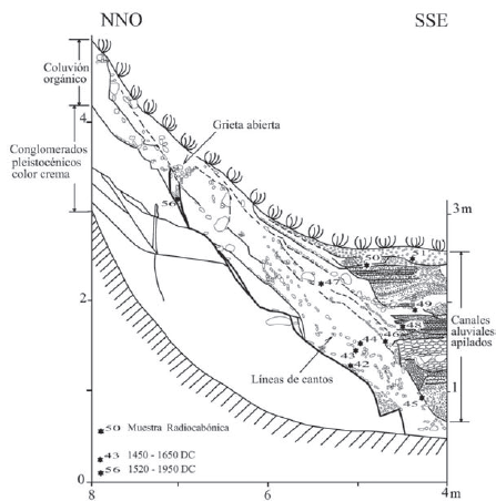 Identificación de los últimos eventos sísmicos: a pesar de la granulometría muy gruesa de losdepósitos expuestos en el perfil de la trinchera, se lograron identificar líneas de cantos y paquetes imbricados de conglomerados, con conspicua geometría de cuña coluvial, así como una grieta abierta rellena, que evidencian la actividad de esta traza de la FB en Quigua (FIGURAS 13 y 14). En función de lo antes descrito, se recolectaron un total de 15 muestras de material orgánico, para así realizar dataciones radiocarbónicas (TABLA 2 y FIGURAS 13 y 14), a fin de acotar el momento de ocurrencia de los principales eventos sísmicos.
