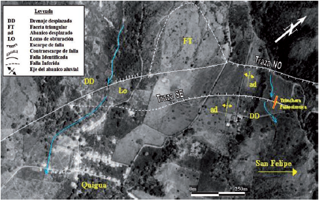 Evidencias morfológicas de la FB, en Hacienda El Playón, en proximidad a la población de Quigua (vista aérea 147 de la misión 020317, a escala 1:25.000 del IGVSB), afectando el abanico fluvio-torrencial homónimo. Se señala la ubicación exacta del sitio de excavación paleosísimica denominado aquí como trinchera de Quigua. Comparar con el bosquejo simplificado mostrado en la FIGURA 5.