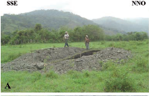 Sitio de excavación de la trinchera paleosísmica de Quigua. A) Vista hacia el NO del sitio de excavación, en referencia con la sierra de Aroa al fondo.