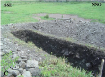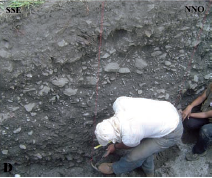 En este sitio, la FB presenta una expresión morfológica muy conspícua, correspondiente consecutivamente de NE a SO a una trinchera de falla y un escarpe de falla de exposición norte (FIGURA 7); este último rasgo morfológico previamente señalado por Schubert (1982). Tales características garantizaron la existencia de simplicidad de la traza activa (FIGURA 7), además de la preservación de materia orgánica y materiales aluviales finamente estratificados (FIGURA 8c); condiciones idóneas para la selección de sitios de excavación paleosísimica (para más detalles, referirse a Audemard, 2003a; 2005). En el sitio particular seleccionado para la ejecución de la excavación, la trinchera de falla corresponde a un dren desactivado por descabezamiento (no corre actualmente agua en su fondo; FIGURAS 8 a y b), con forma de bayoneta que registra desplazamiento de su curso en forma dextral. La trinchera fue excavada ortogonal al rumbo de la falla, en forma manual y con dimensiones finales de 8,20 m de largo, 1,40 m de ancho y 2,50 m de profundidad promedio. (Error 5: La referencia FIGURAS 8 debe estar ligada) (Error 6: El tipo de referencia FIGURAS 8 es un elemento obligatorio) (Error 7: No existe una url relacionada)