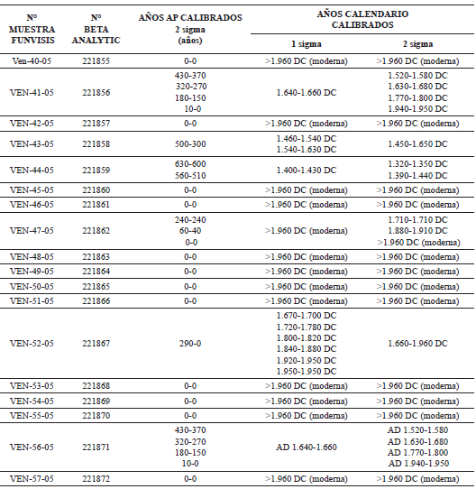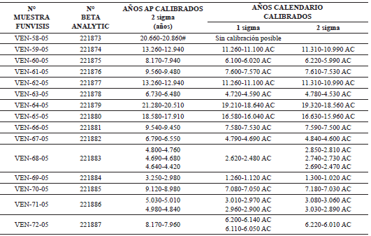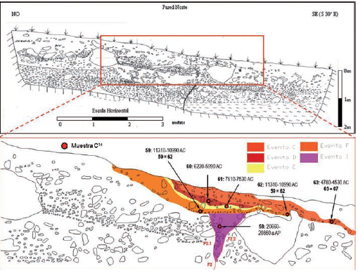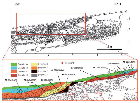 El evento más antiguo registrado en esta excavación lo soporta la muestra VEN-58-05, con una edad no calibrada de 20660-20860 a AP, el cual no pudo ser calibrado, ya que al momento de realizar los análisis el laboratorio no poseía curvas de calibración para muestras con edad mayor a 20.000 años. Está registrado por una grieta abierta en forma de embudo, en la terminación superior de uno de los planos de falla (FIGURA 14; evento I), la cual está rellena de material coluvial en una franja de deformación que alcanza 40 cm de ancho en el tope del embudo.