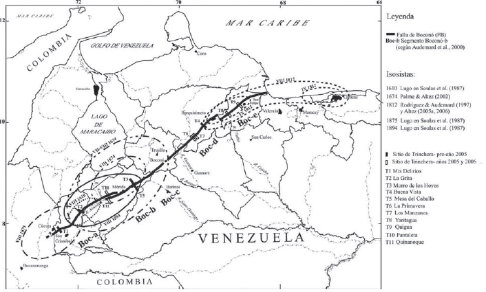 Ubicación relativa de las excavaciones paleosísmicas realizadas entre 1986 y 2006 sobre la Falla de Boconó (según Audemard, 2008; 2010). Se muestra igualmente la segmentación de esta falla mayor propuesta por Audemard et al. (2000), así como las isosistas de intensidad VIII o superior de los principales sismos históricos discutidos en este trabajo. Se muestra tal isosista porque ésta es representativa de la longitud de ruptura del sismo responsable. El sismo de 1812 particularmente muestra que se compone de dos subeventos, uno con foco a lo largo del segmento Boc-e de la FB en el valle del Yaracuy, mientras el segundo ocurre costa afuera a lo largo de la costa centro-norte de Venezuela.