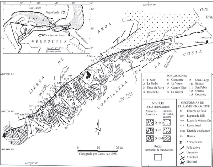 Casas, A.M. 1995. Geomorphological and sedimentary features along an active right-lateral reverse fault (Yaracuy basin, Venezuela). Zeitschrift für Geomorphologie, 39(3): 363-380.