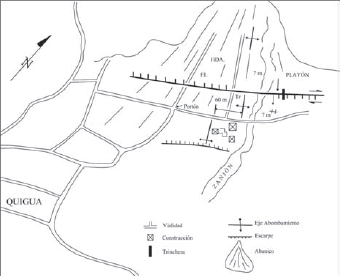 Dibujo simplificado del abanico de Quigua, en vista oblicua hacia el NNO, en la Hacienda El Playón, donde se señalan las geoformas que identifican la traza activa de la FB, como las que sustentan su cinemática dextral en esta localidad. Nótese el desplazamiento hacia la derecha del eje del abombamiento del abanico en 60 m, como de pequeños cursos de agua intermitentes que surcan su superficie en sólo 7 m.