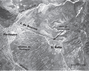Vista aérea de la misión 020317, mostrando el abanico de Yaritagua desconectado parcialmente del relieve y desplazado dextral por la FB (Cortesía del Instituto Cartográfico Venezolano Simón Bolívar –IGVSB-). Se señala la ubicación de la excavación paleosísmica denominada Yaritagua, próxima a la localidad de El Salto.