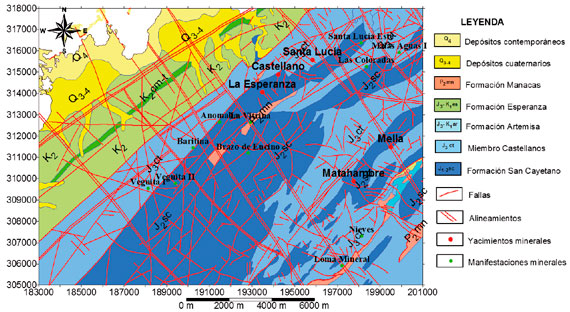 Para la realización del trabajo se contó con los informes de búsqueda y exploración realizados en el área, así como artículos y publicaciones referentes a la misma. En la geología de la región la Formación San Cayetano (Jurásico Inferior-Superior) es la más antigua. Son comunes en ella las estructuras de ripple marks. La base de la Formación es desconocida en ella se encuentran los yacimientos y manifestaciones minerales del área. Se presume que la Formación se formó dentro de un palaeoambiente deltaico, situado en un margen continental pasivo y está compuesta por limolitas y argilitas de color gris a gris oscuro, pardo y violáceas, finamente estratificadas con aspecto pizarroso, intercaladas con areniscas cuarzosas y cuarzo-micáceas, estratificadas de color blanquecino o amarillo rojizo a veces algo oxidado y con espesores variables. También afloran limoareniscas estratificadas de color naranja intercaladas con limolitas. En las limolitas aparecen con frecuencia concreciones terrígenas con estructura concéntrica que generalmente oscilan entre 2 y 4 cm de diámetro. Las limolitas y lutitas pueden contener abundante materia orgánica siendo muy carbonosas y con una coloración gris muy oscuro a negras cuando no están muy meteorizadas. Las rocas que poseen buzamiento monoclinal hacia el NO están complicadas por pequeñas deformaciones locales del plegamiento y por dislocaciones disyuntivas. Juegan un papel determinante en la estructura del yacimiento las dislocaciones disyuntivas longitudinales y transversales (Ovchinnikov et al., 1987).
