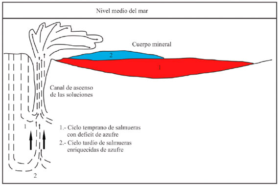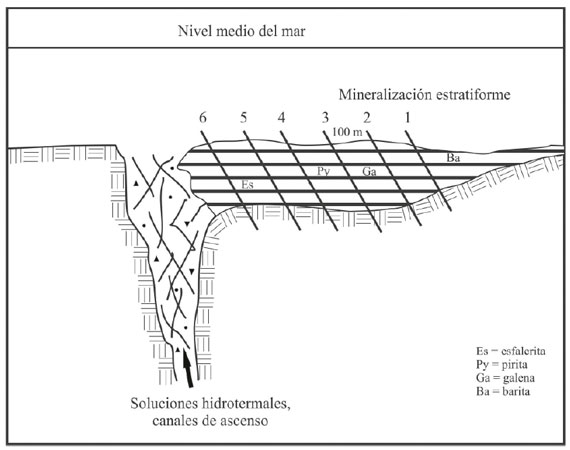Sedimentos terrígenos deltaicos son depositados en el margen continental pasivo formado con la apertura del mar Caribe (Jurásico Inferior). El agua de mar penetra en el material consolidado (A). Las fallas profundas formadas en el margen continental como resultado de la apertura, son los canales de filtración y vías de circulación del agua de mar desde las profundidades hasta la superficie, remobilizando los iones contenidos en las rocas e incorporados en todo el proceso (B). Cuando el agua caliente enriquecida en iones metálicos tiene contacto con el azufre presente en el ambiente reductor del fondo de la Cuenca reacciona formando la asociación mineral típica de estos depósitos que con el tiempo se va depositando en el fondo de la cuenca (C).