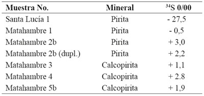 Valdés et al. (1993), aseveran que la mineralización del yacimiento Santa Lucía pertenece al tipo SEDEX y que se encuentra localizada sólo en los estratos de esquistos negros y en menor medida en las arcillas y que contactan con la secuencia silícea y areniscas de la formación San Cayetano. A partir de análisis isotópicos realizados al d34S de la pirita de yacimiento Santa Lucía es evidente, que el azufre de la pirita proviene de la reducción bacterial, mientras que en el resto de los yacimientos es de origen endógeno. Lo que le da el carácter marino sedimentario a sus menas (TABLA 1).