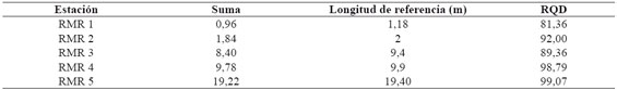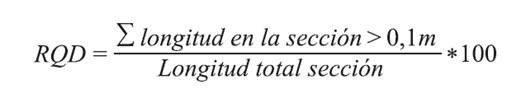 Con los datos de la TABLA 4 se estimó el valor RQD (Rock Quality Designation) para cada afloramiento mediante la FÓRMULA 1, la cual implica descartar en las sumas separaciones entre discontinuidades que son menores a 0,1 m.