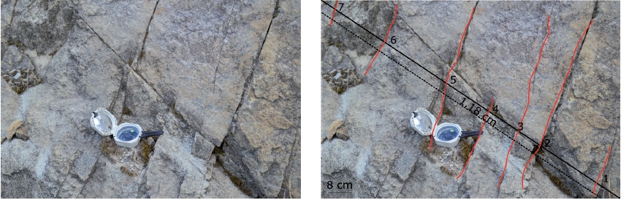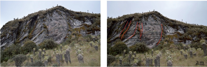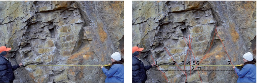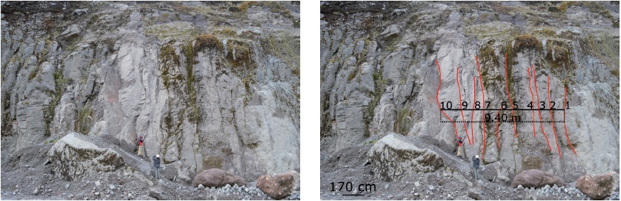 Análisis RMR para rocas observadas en la vía Tufiño-Maldonado (Ecuador). Se observan fracturas abiertas (ejemplo: fractura 3) y cerradas y presencia de alteraciones de colores claros. Fracturas y diaclasas de aproximadamente 1- 3 m. Algunas fracturas son sinuosas. El análisis RMR se realizó a lo largo de una longitud de referencia de 10 metros (línea recta negra).